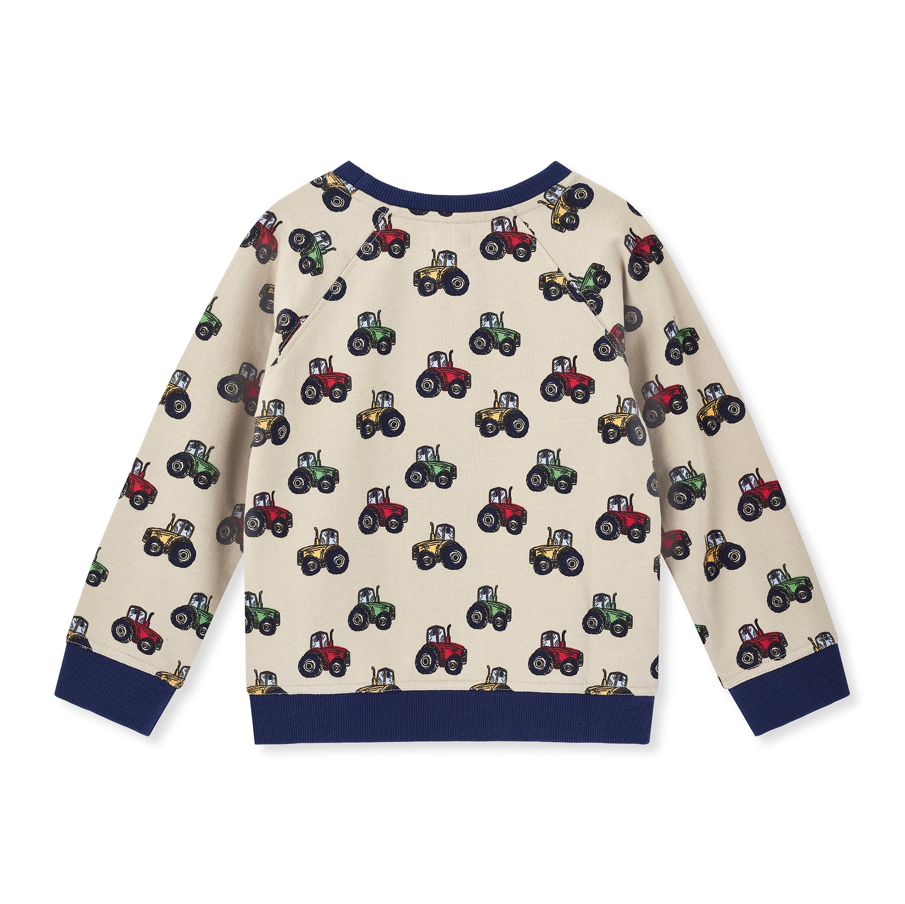 Designed for every age and made for everyday adventures, our stone Tractor print sweatshirt is a playful nod to countryside charm. Crafted from 100% GOTS certified organic cotton, it's soft on skin and kind to the planet. Featuring a hand-drawn tractor print on a classic stone base, this cosy layer is perfect for mixing, matching, and making memories. Ethically produced in our animal-product-free factories, its a durable, planet-friendly piece designed to last through every tumble, splash, and snuggle. A timeless favourite with a fun twist made to be loved and passed on.